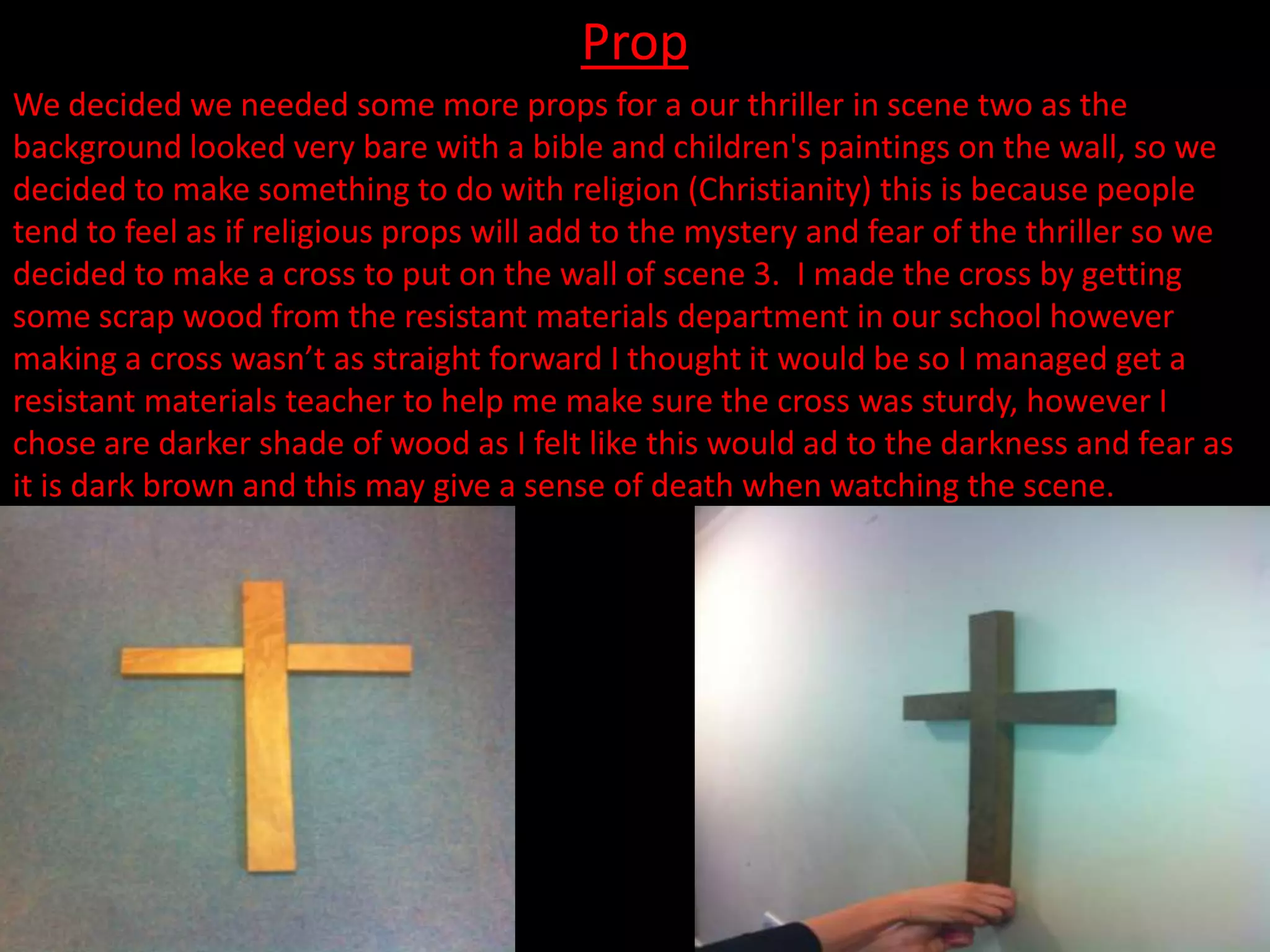 The document discusses props for a school thriller play. The writers decided they needed more religious props like crosses to add mystery and fear to scenes 2 and 3. A cross was made for the wall in scene 3 from scrap wood, with help from a resistant materials teacher to make it sturdy. A dark brown wood was chosen for the cross to give a sense of death and add to the darkness in the scene.