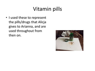This document lists and describes props that were used in a film trailer, including vitamin pills representing drugs given to the main character, a knife representing a weapon used in a crime, sunglasses worn by characters to distinguish the present from the past, a glass of water used when ingesting pills, and a cushion used in a scene where one character tells another to leave the room.