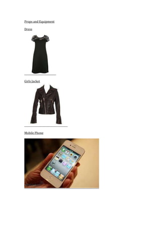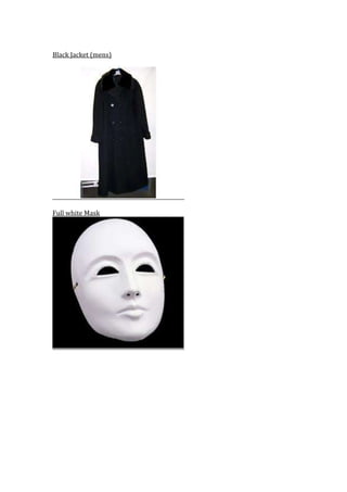 The document lists various props and equipment including a girl's jacket, black mens jacket, full white mask, knife, Panasonic camera, and tripod that could potentially be used in a scene requiring disguises and surveillance equipment.