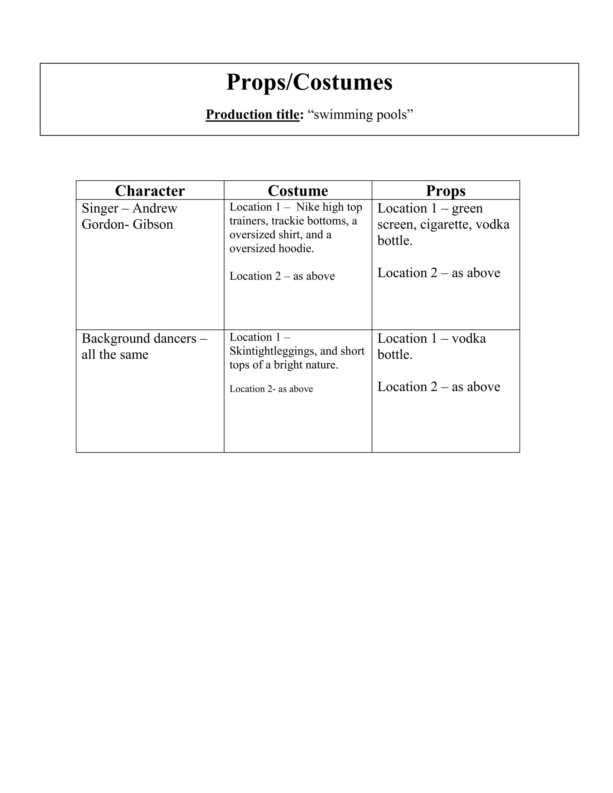 This document outlines character costumes and props for a music video production titled "swimming pools". The singer Andrew will wear Nike shoes, track pants, an oversized shirt and hoodie for two locations. Background dancers will wear bright colored tight leggings and short tops for two locations. Props include a green screen, cigarette and vodka bottle for the singer at one location, and just a vodka bottle for the second.