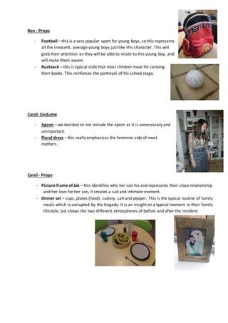 This document outlines the proposed props and costumes for characters in a film. James, a teenage boy protagonist, will drive a Peugeot 106 and use a Samsung phone to appear average. His costume of jeans, plimsolls, and a plain blue t-shirt is meant to keep him neutral while appealing to most teenage boys. Ben, a schoolboy, will wear an Aston Rowant school uniform and carry a football and rucksack to represent innocent young boys. Carol, a mother, will wear a floral dress and be photographed with her son Jak and a dinner set to show their close relationship. Police officers will wear hats, black shoes/trousers, a white shirt, and black tie to portray a