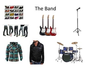 The document discusses costumes and props for characters in a music video. The band will wear contemporary outfits like leather jackets, checked shirts, and skinny jeans. Anita, the popular girlfriend, will wear casual clothes like jeans and a hoodie for school scenes, and a party dress and jewelry for a party scene. Derrick, the popular boyfriend, will have a sporty look with a baseball jacket and sneakers to portray a "jock." Najim, the geek, will dress in corduroys and oversized glasses normally, and as a clown for the party to portray a class clown. A video camera on a tripod will be used to film footage, which will then be edited