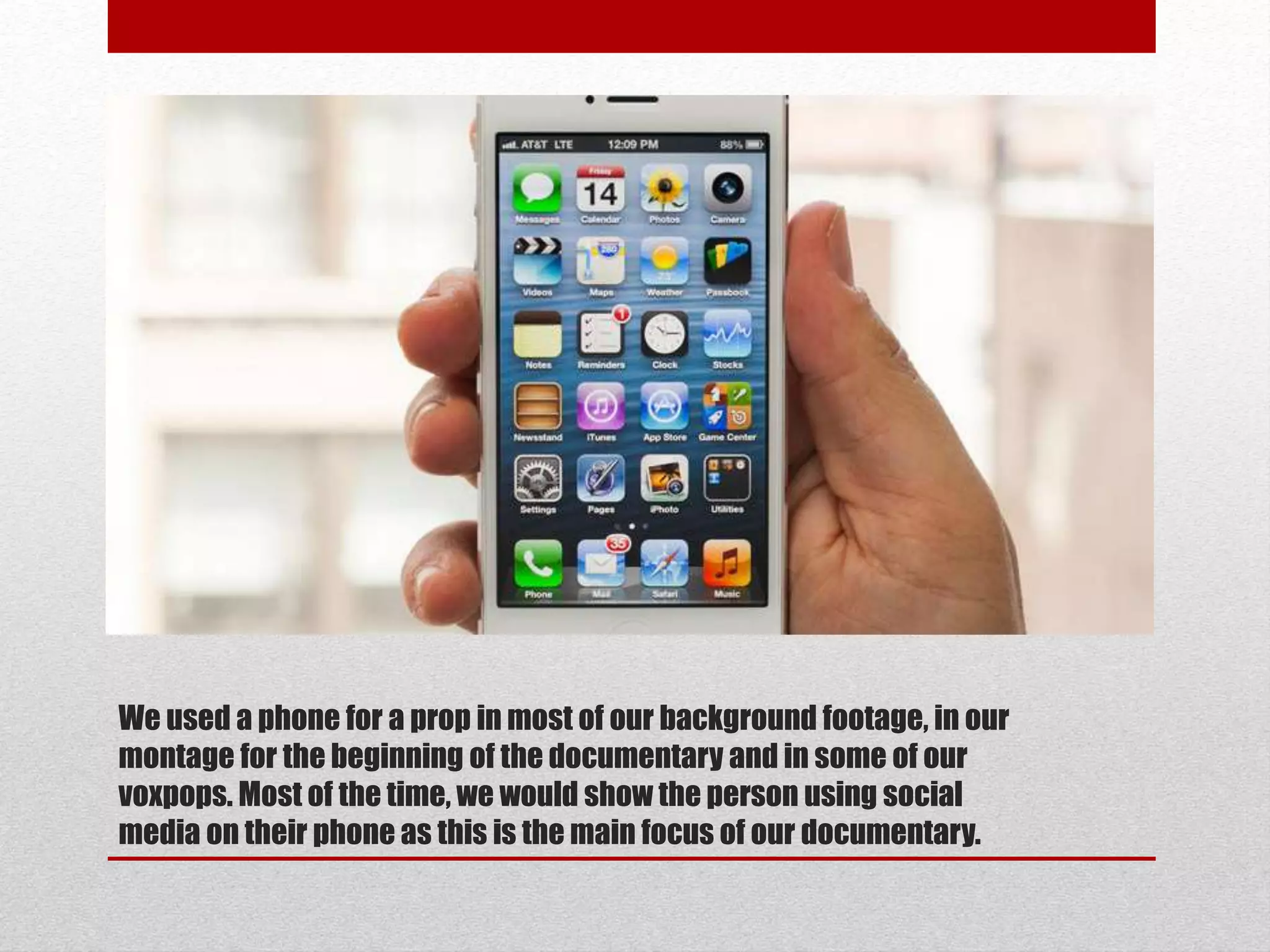 This document contains a props list and filming schedule for a documentary about how social media impacts education. Phones and computers were used as props to show people using social media. In background footage and interviews, revision notes and laptops were also used to make scenes more realistic. The schedule details the equipment and locations needed over multiple days to film b-roll, interviews, a home video scene, and vox pops.