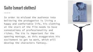 The document discusses props that will be used in a short film to help tell the story and develop characters. The main character Oscar's clothing at the start is meant to suggest he has a professional, wealthy life that is later revealed to be a fantasy. Other props like an alarm clock, newspaper, computer, radio, bike, jar of money, and pencil and paper will be used to represent different aspects of Oscar's reality versus fantasy, transition between scenes, and show his character's progression over the course of the film. The radio in particular plays music that shifts from non-diegetic to diegetic to connect the two realities Oscar experiences.