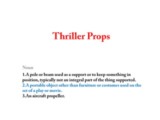 This document discusses the use of props in film scenes to convey meaning and establish context. It describes props used in scenes depicting a crime scene, a baby's bedroom, and a teenager's bedroom obsessed with the supernatural. Props like police tape, candles, pictures, toys and a Ouija board help set the scene and tone while adding realism and tension. Continuity of props like a teddy bear and matches between scenes is important to connect characters and story elements.
