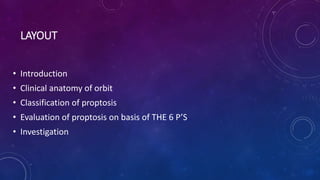 3. Common causes of proptosis include thyroid eye disease, orbital tumors, infections, vascular lesions, and trauma. The document discusses the clinical anatomy of the orbit and approaches to classify and investigate proptosis.