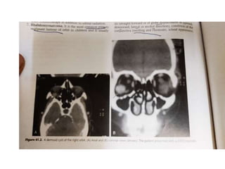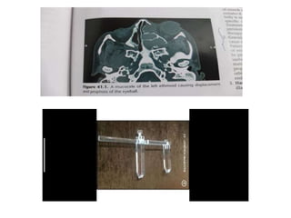 Proptosis is the forward displacement of the eyeball due to a disease process within or adjacent to the orbit. The eyeball can be displaced in different directions due to the rigid walls of the orbit. Common causes of proptosis include neoplastic masses like rhabdomyosarcoma or optic glioma in children, vascular lesions such as venous varices or cavernous hemangiomas in adults, and inflammatory or infectious processes. Evaluation involves a detailed history, physical exam to assess eye displacement and vision, and imaging tests like CT or MRI. Management depends on the underlying cause and may include biopsy, chemotherapy for cancers, surgery to remove masses, or orbital decompression for conditions like Graves' disease.