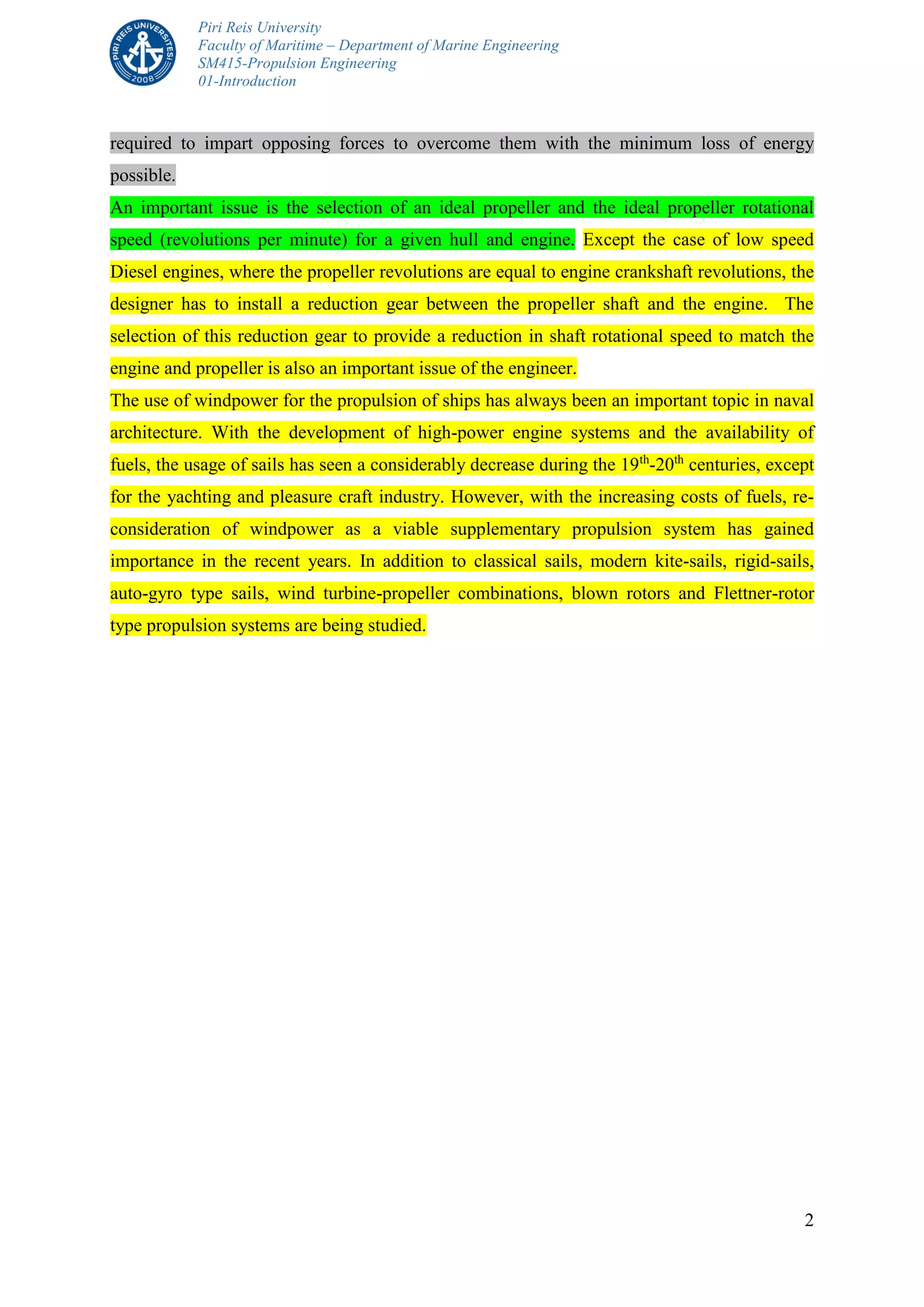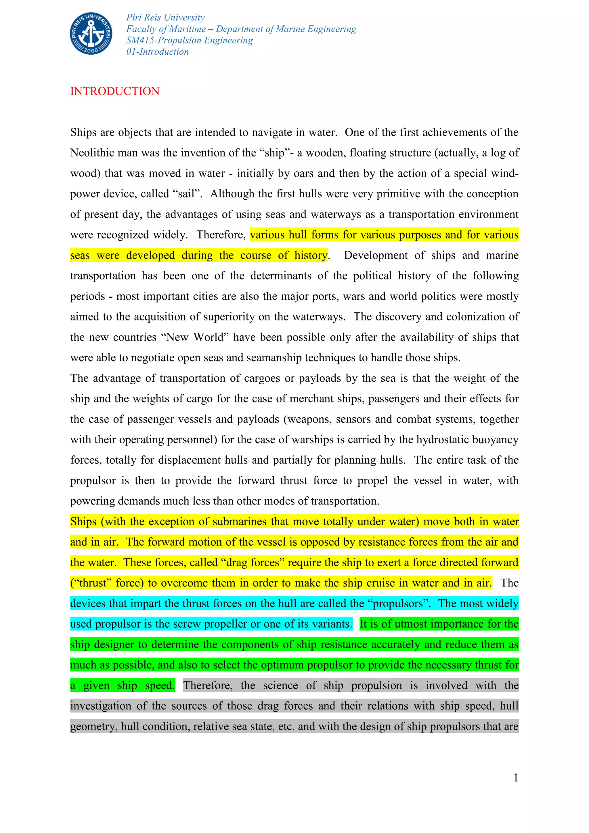 This document provides an introduction to ship propulsion engineering. It discusses how ships have evolved from primitive wooden structures moved by oars and sails to various hull forms designed for different purposes and seas. Transportation by sea allows for cargo, passengers, and payloads to be carried by buoyancy forces, requiring less power than other modes of transportation. Ships move through both water and air, facing resistance drag forces from both environments. Propulsors, most commonly screw propellers, impart forward thrust forces to overcome drag and allow ships to cruise. Ship propulsion science studies resistance sources and relations to optimize hull design and select the most efficient propulsor. Selection of an ideal propeller and its rotational speed to match the engine is also