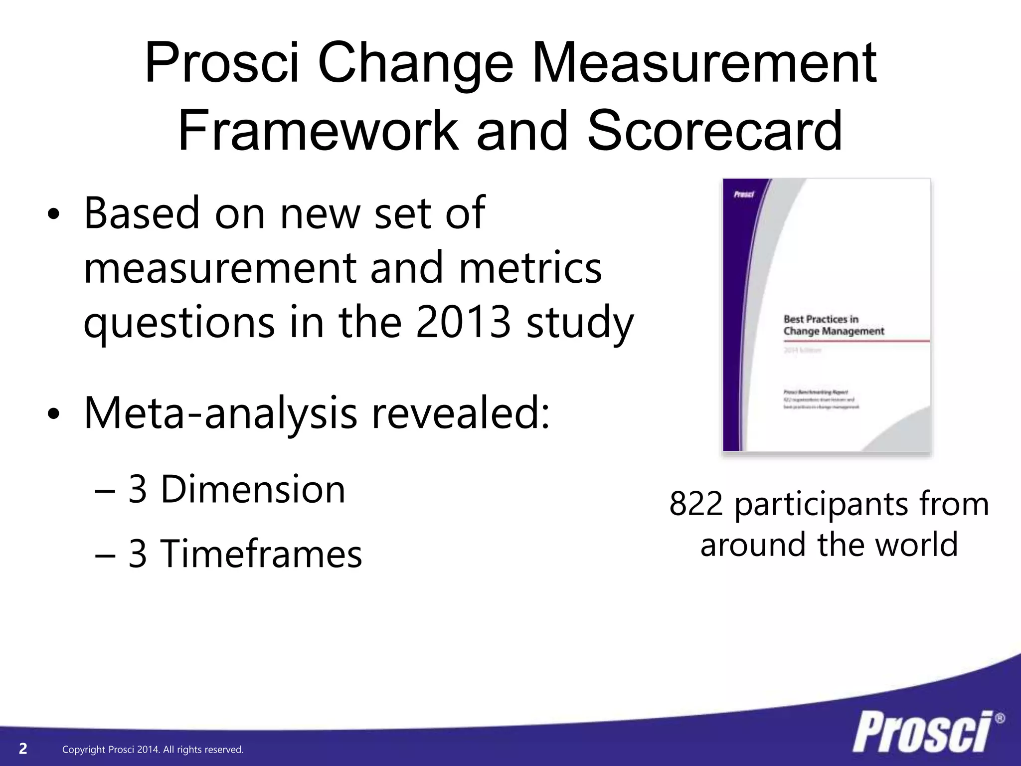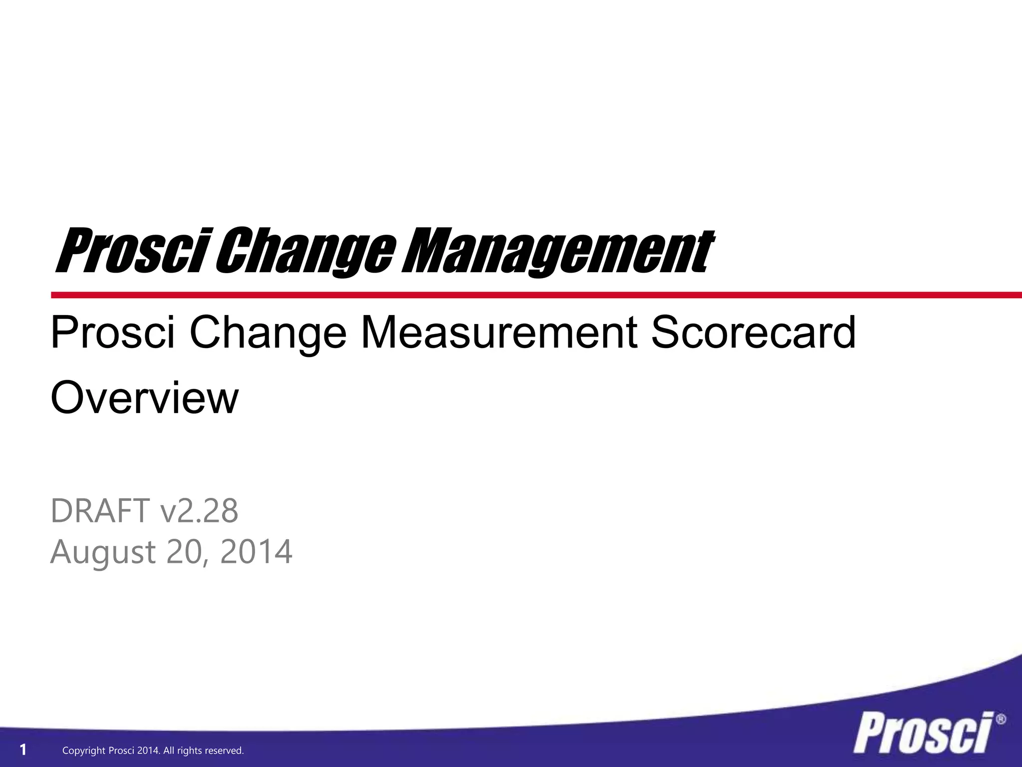 The document describes a Change Scorecard created by Prosci to track the success of change initiatives. The scorecard measures three areas: Organizational Performance by tracking results and outcomes, Individual Performance by assessing adoption and usage, and Change Management Performance by evaluating the effectiveness of the CM approach. For each area, the scorecard provides a framework to Define goals and metrics, Track progress, and Deliver final performance outcomes. Using the scorecard allows organizations to better manage change initiatives and ensure benefits are realized.