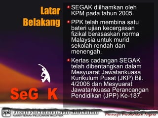 Dokumen tersebut membahas tentang Standard Kecergasan Fizikal Kebangsaan (SEGAK) untuk murid sekolah di Malaysia. SEGAK dikembangkan oleh Kementerian Pendidikan Malaysia pada tahun 2005 untuk mengukur dan merekod tahap kecergasan fizikal murid. Dokumen ini menjelaskan latar belakang, komponen pengujian, peralatan, dan norma kecergasan fizikal untuk murid berdasarkan umur dan jenis kelamin.