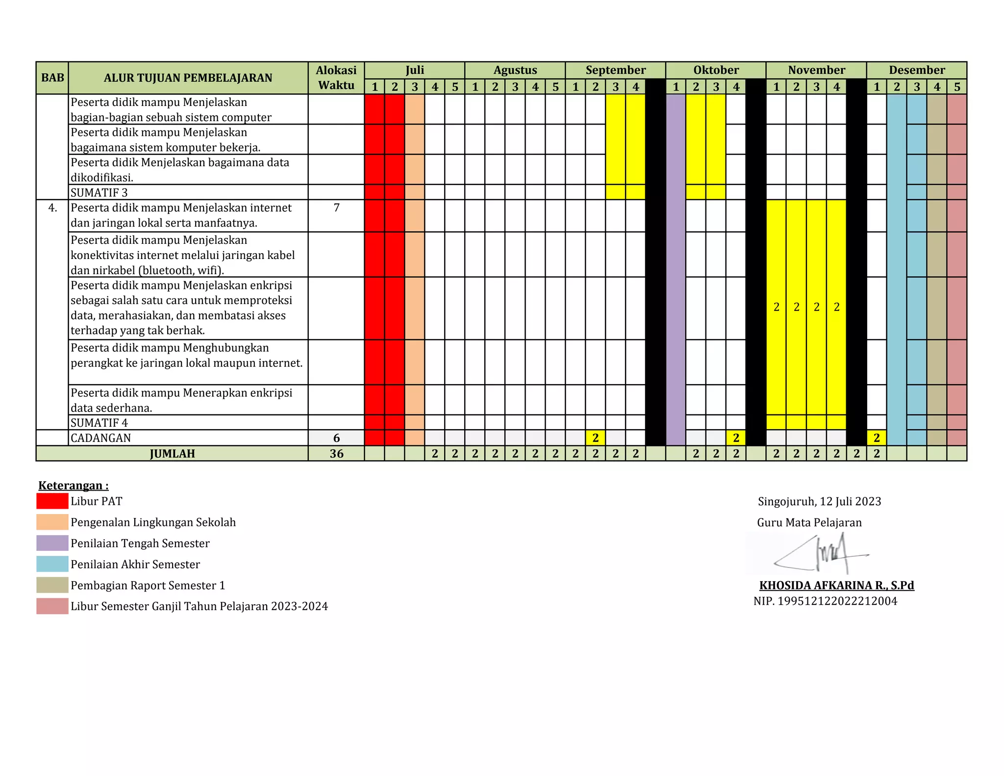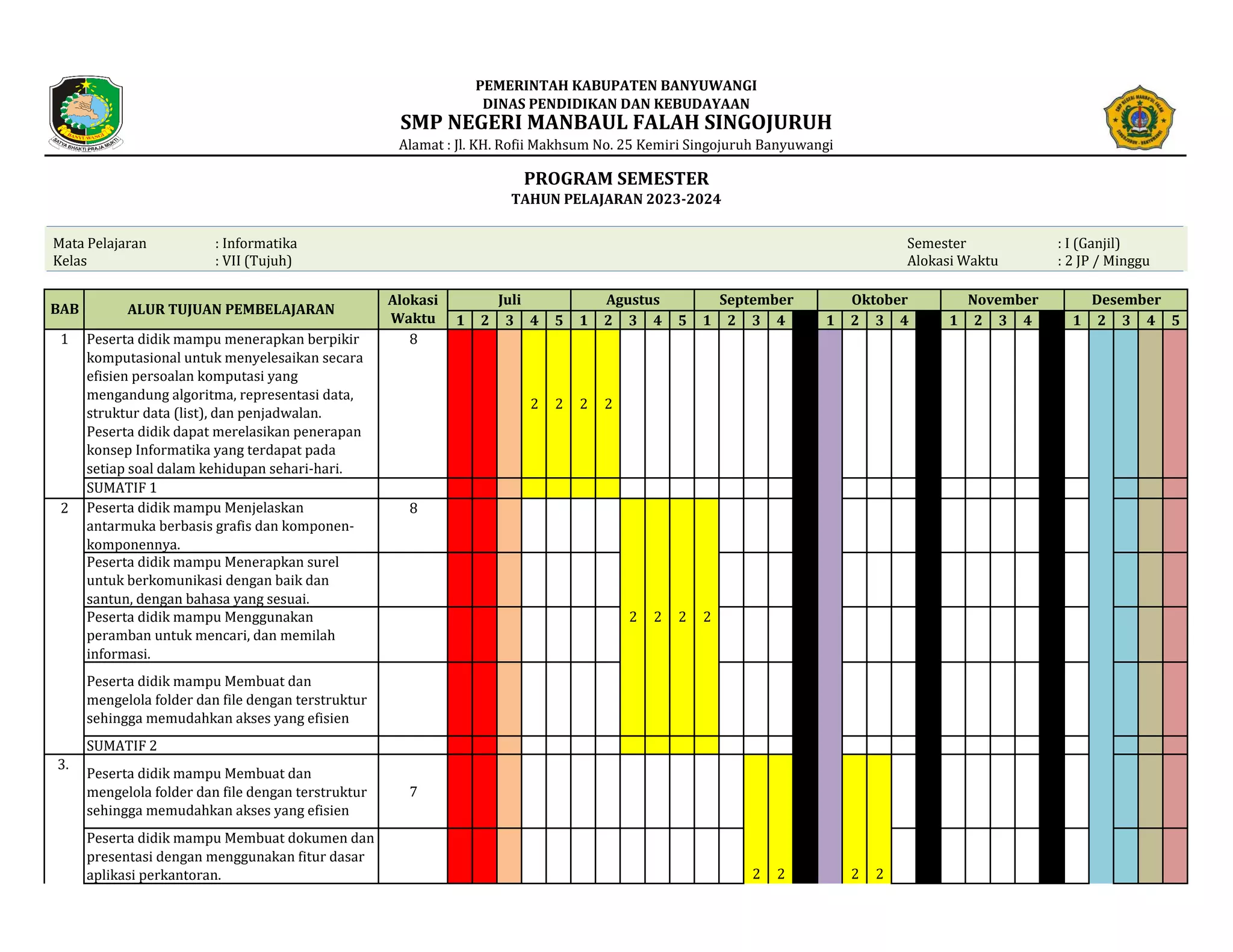 Teks tersebut merupakan program semester mata pelajaran Informatika untuk siswa kelas VII SMP Negeri Manbaul Falah Singojuruh. Teks tersebut menjelaskan alokasi waktu pembelajaran, tujuan pembelajaran yang mencakup konsep-konsep dasar sistem komputer, jaringan, dan aplikasi perkantoran, serta jadwal evaluasi.