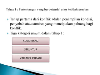 Dokumen ini menjelaskan proses konflik yang terdiri dari lima tahapan, mulai dari pertentangan hingga hasil, serta mengidentifikasi kategori penyebab konflik. Berbagai teknik penanganan konflik dijelaskan, termasuk bersaing, bekerjasama, dan menghindar, dengan fokus pada manajemen konflik yang efektif. Selain itu, dokumen ini membahas konsekuensi fungsional dan disfungsional dari konflik terhadap kinerja kelompok.