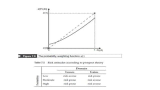 - It incorporates concepts like the certainty effect, reflection effect, and isolation effect to account for behaviors not predicted by expected utility theory.