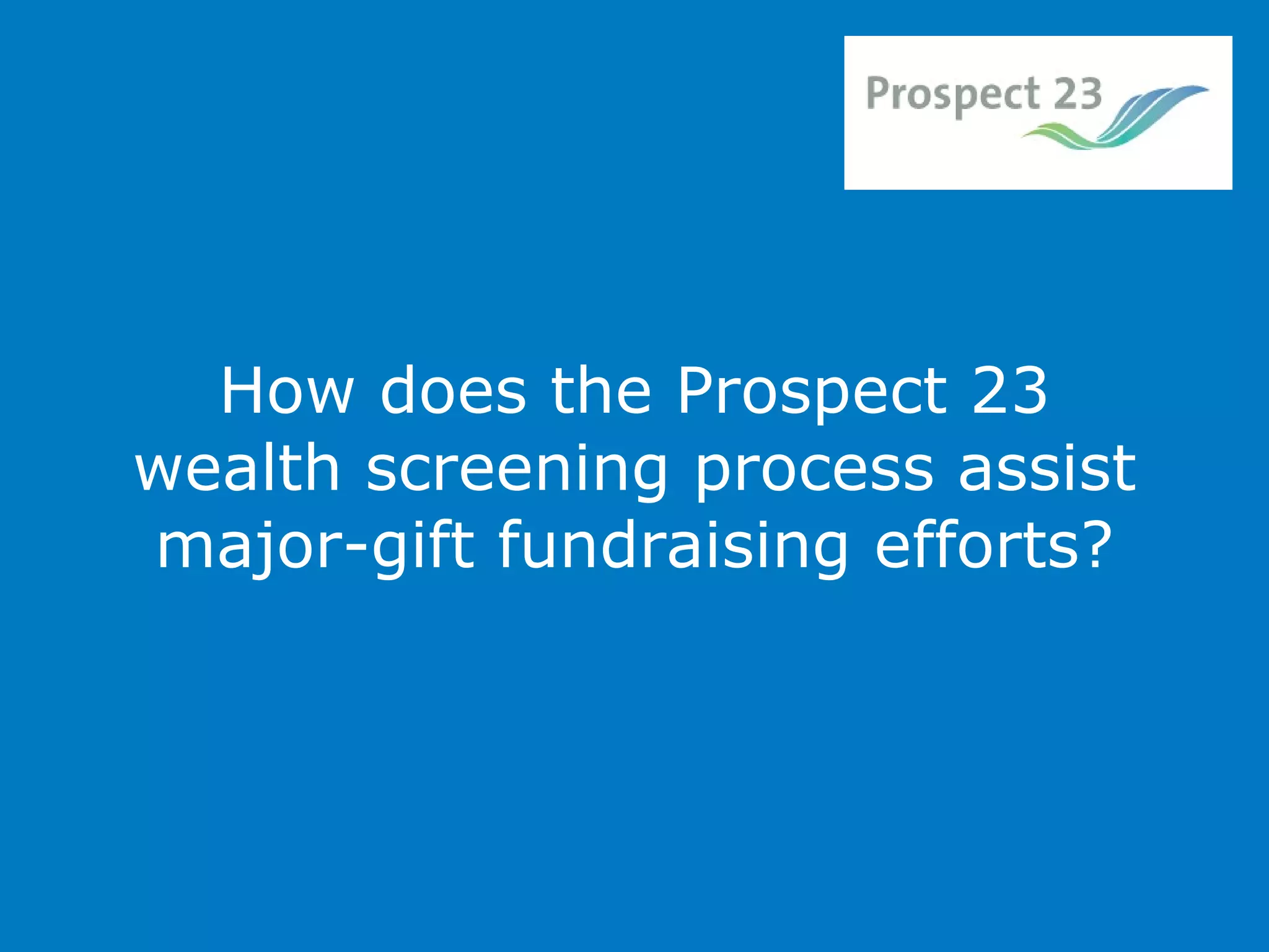 The Prospect 23 wealth screening process assists major-gift fundraising efforts by taking donor data and identifying major gift prospects. It qualifies prospects by concluding on their profession, providing live directorship information, categorizing them by wealth and giving potential, supplying notes on each major prospect, providing age details where available, and showing the total potential fundraising value and statistically analyzing the donor database pool.