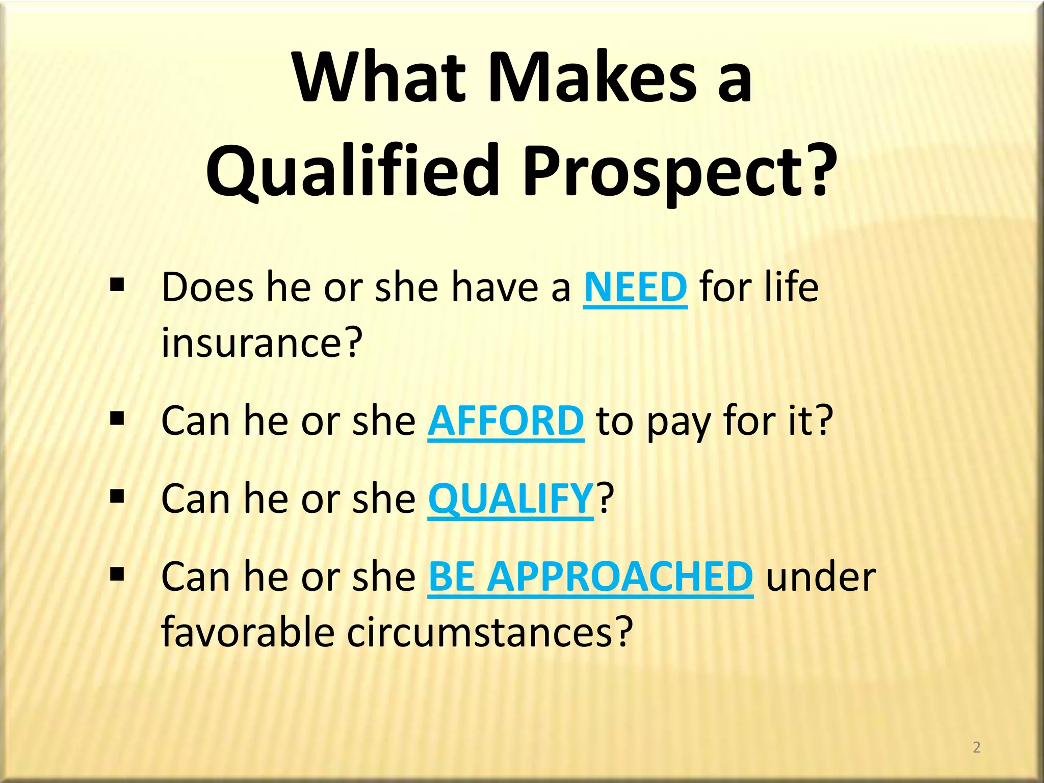 This document provides information on identifying qualified prospects for life insurance sales. It defines what makes a qualified prospect, including that they have a need for life insurance, can afford it, and can qualify medically and financially. It also discusses factors that indicate increased need for life insurance, such as financial improvements, increased responsibilities, or life changes. The overall message is that successful prospecting requires identifying individuals who have both the need for and ability to purchase life insurance products.