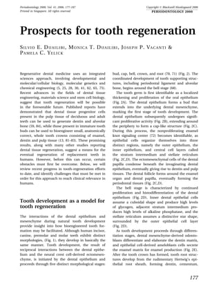This document discusses prospects for tooth regeneration. It begins by reviewing tooth development as a model for regeneration, noting the stages of bud, cap, bell, crown and root. It then discusses the regenerative capabilities of naturally formed dental tissues, noting that enamel has no regenerative ability while dentin, cementum, pulp, and alveolar bone do to varying degrees. The document concludes by discussing postnatal dental stem cells that have been identified and their role in dental tissue regeneration experiments that have generated tooth crowns containing enamel, dentin, pulp and bone.