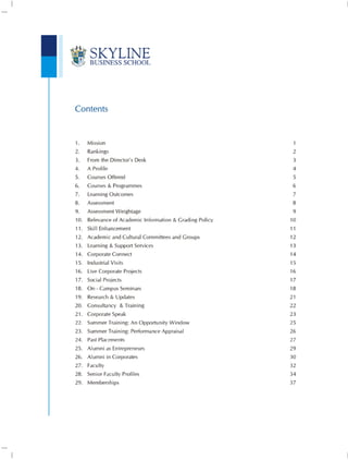 The document provides information about Skyline Education Group, which comprises several educational institutions including Skyline Business School. The mission of Skyline is to provide students with career prospects in the global workplace and equip them for professional fields. It offers various degree and diploma programs in areas such as business, mass communication, and tourism. Skyline aims to give students world-class education through methods like industry interactions, case studies, and seminars from guest faculty. It also focuses on developing students' soft skills and helping them secure placements through its active placement cell.