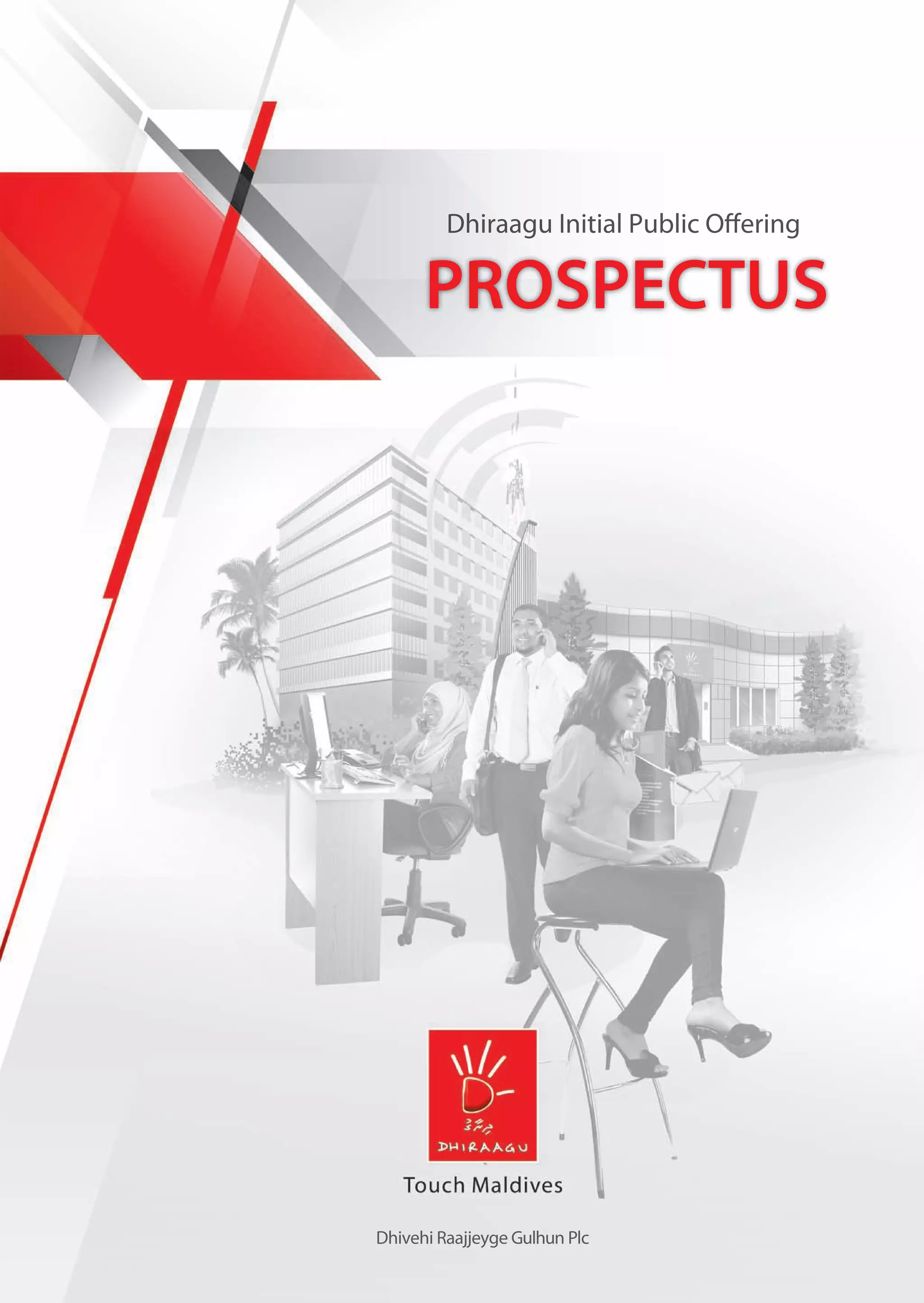This prospectus provides information about Dhiraagu Plc and its planned share issue. It details the company background, telecom sector in Maldives, Dhiraagu's profile and financials, risks, corporate governance and board of directors. The prospectus seeks to invite investment in 11.4 million shares of Dhiraagu at a price of MVR 80 per share, totaling MVR 912 million. Approvals have been received from relevant authorities for the share issue and listing on the Maldives Stock Exchange.