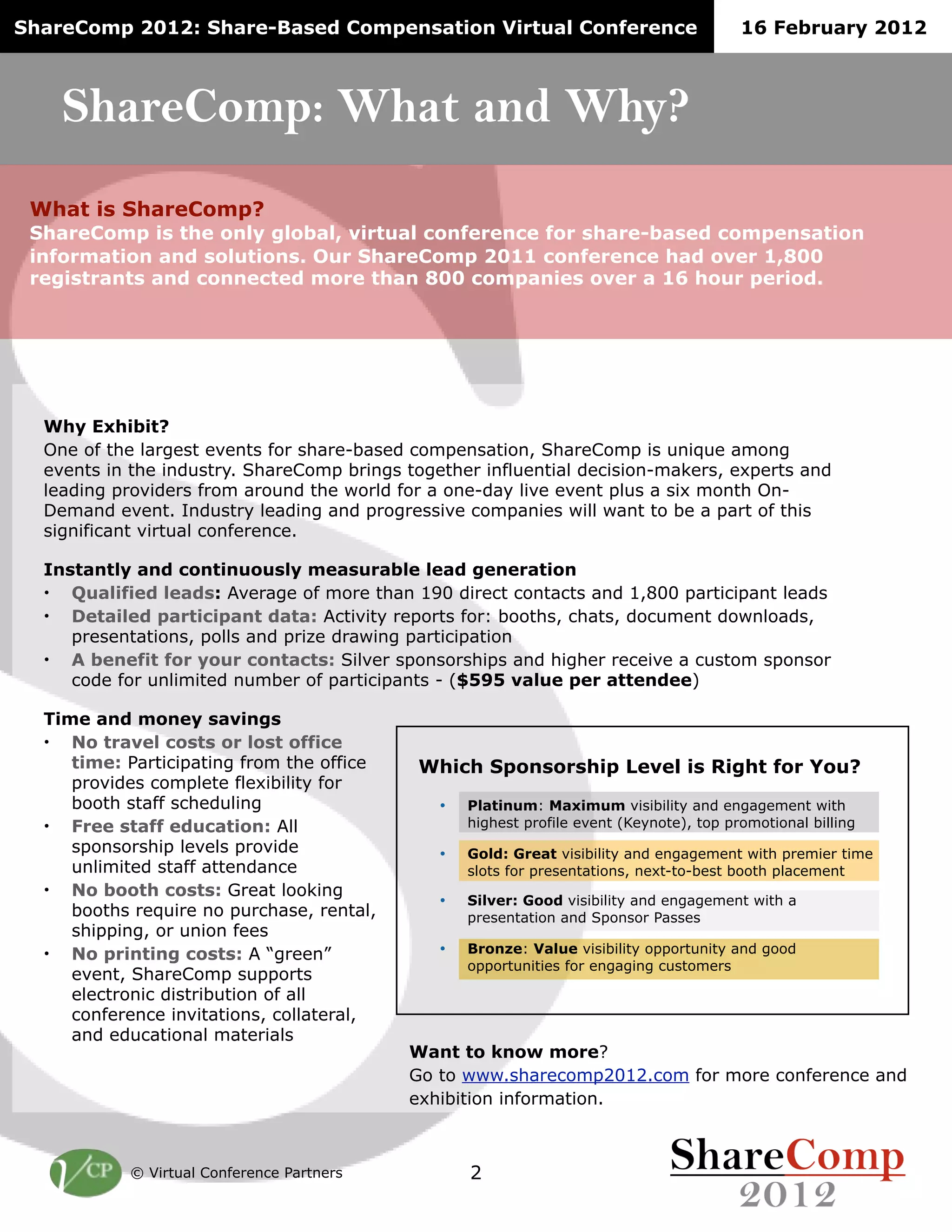 The ShareComp 2012 virtual conference on share-based compensation is scheduled for February 16, 2012, and offers attendees access to influential industry leaders and measurable lead generation opportunities. Sponsorship packages provide various levels of engagement, visibility, and access to real-time reports and participant interactions, all while saving participants costs associated with traditional conferences. The event will run live with on-demand access for six months, allowing for increased attendee engagement and networking opportunities.