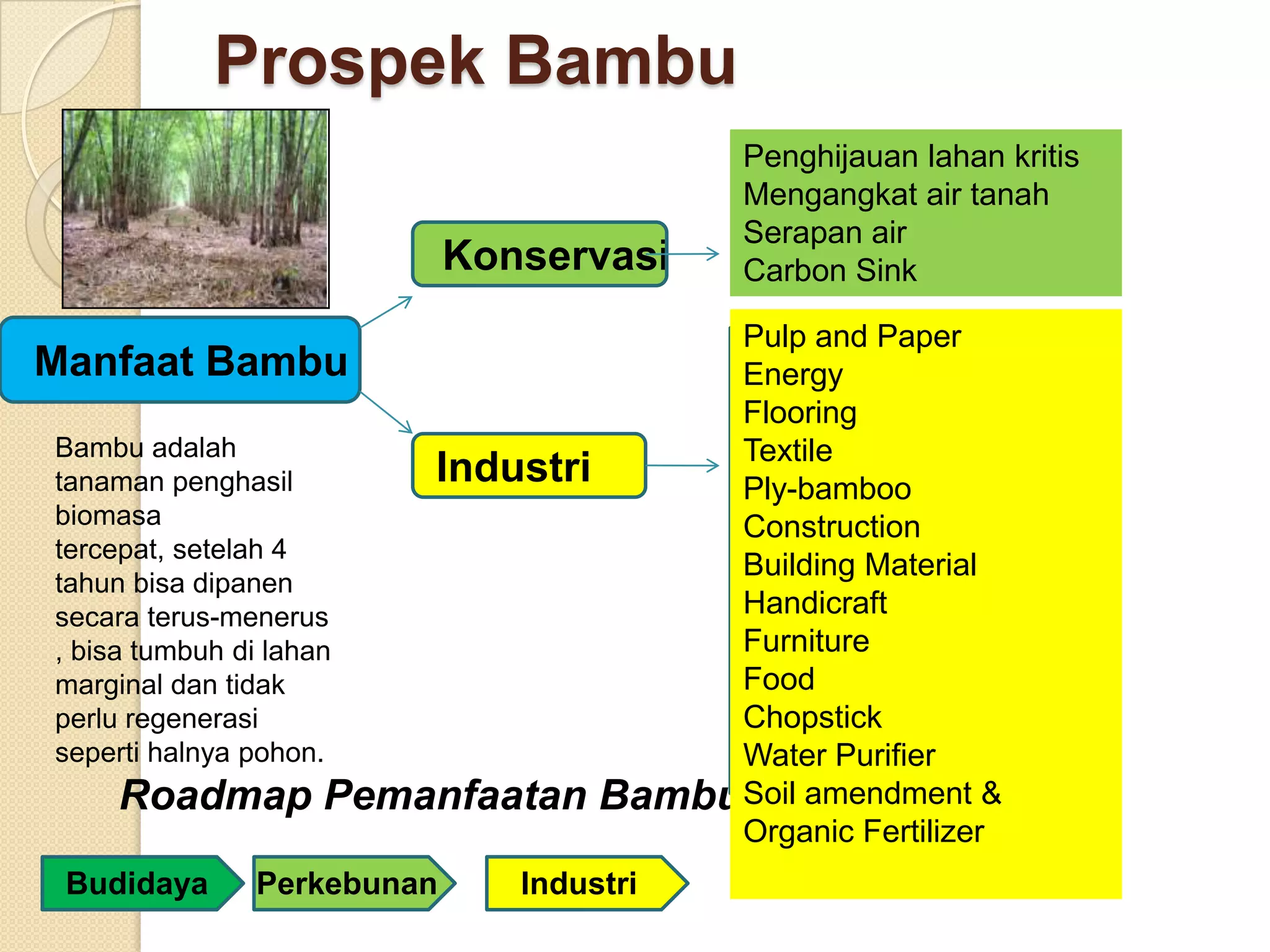 Dokumen ini membahas potensi bambu untuk penghijauan lahan kritis dan manfaatnya sebagai sumber daya energi, material bangunan, dan produk industri. Selain itu, dijelaskan tujuan dari pemanfaatan bambu yang meliputi peningkatan nilai guna lahan, penyerap tenaga kerja, dan pengembangan industri berkelanjutan. Bambu juga memiliki peran dalam konservasi air dan perbaikan lingkungan.