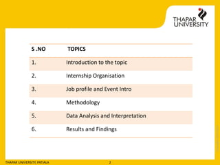 The document discusses an internship project on organizing the Smart Rail India 2016 Conference & Expo. It provides details on the internship organization Prospurs Pvt. Ltd., which is an event managing and consulting firm. The intern was involved in various tasks for the Smart Rail India event including planning, research, finance, analysis, and public relations. Key aspects of organizing the event such as developing the agenda, identifying stakeholders, generating leads, and data analysis are summarized. The event saw participation from 140 people total, including 40 paid delegates, generating total revenue of Rs. 640,000 for the company.