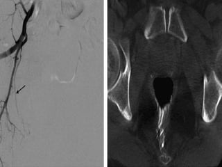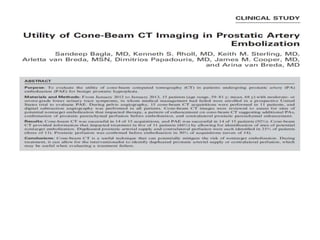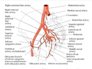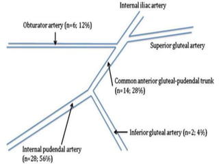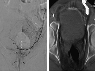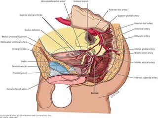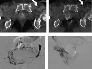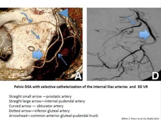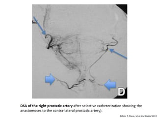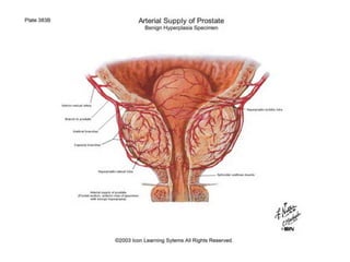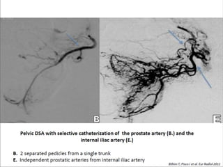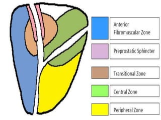 The prostate gland is a pyramid-shaped organ that weighs approximately 20 grams and measures 3x4x2 cm. It has three zones - the peripheral zone (70%), central zone (25%), and transitional zone (5-10%). Prostate cancer develops in the peripheral zone, while benign prostatic hyperplasia (BPH) develops in the transitional zone. The prostate receives its blood supply from various arteries, most commonly the internal pudendal artery (34%). Knowing the detailed arterial anatomy is important for procedures like prostate artery embolization (PAE) to treat conditions like BPH and prostate cancer. Imaging tools like CT angiography and cone beam CT can help the interventional radiologist map the arterial supply before