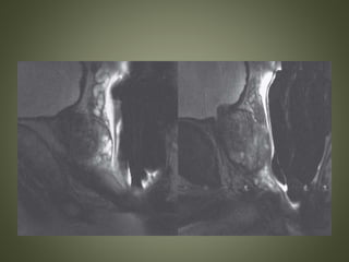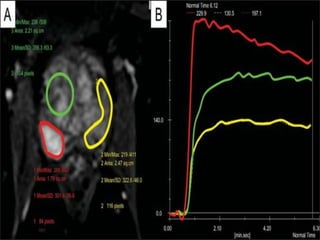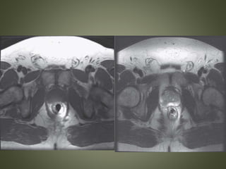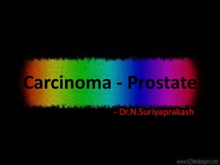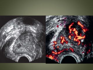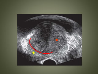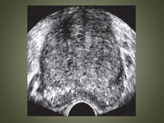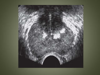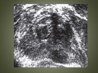 Prostate carcinoma is the most common malignancy in males, typically affecting men over 50 years old. On transrectal ultrasound (TRUS), prostate carcinoma usually appears as a hypoechoic lesion in the peripheral zone. Multiparametric MRI with T2-weighted, diffusion-weighted, and dynamic contrast-enhanced sequences is the most sensitive imaging method for detecting prostate carcinoma, as it can identify restricted diffusion and abnormal enhancement patterns not seen on ultrasound. While imaging is useful for detection and staging of prostate carcinoma, biopsy remains the standard for diagnosis.