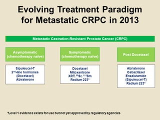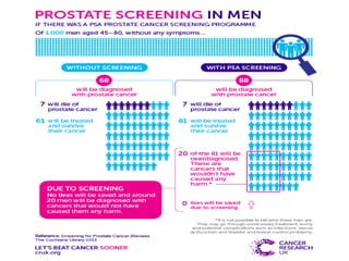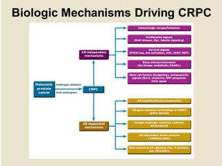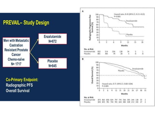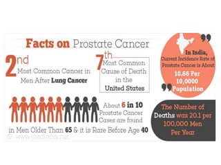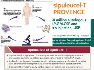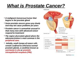 This document discusses prostate cancer screening, diagnosis, staging, and treatment options. It covers PSA testing and digital rectal exams for screening. Biopsies and PSMA PET scans are used for diagnosis and staging. Risk stratification helps determine treatment, which may include radical prostatectomy, radiotherapy, hormone therapy drugs like abiraterone acetate and enzalutamide, chemotherapy like docetaxel, or bone-directed drugs for metastases. Complications of prostatectomy include blood transfusions, infections, incontinence, and erectile dysfunction. Radiotherapy and hormone therapies can cause side effects like fatigue, fluid retention, and liver enzyme changes.