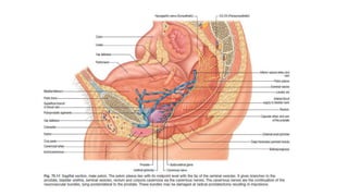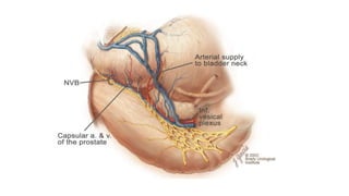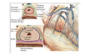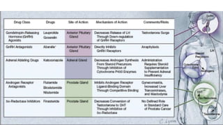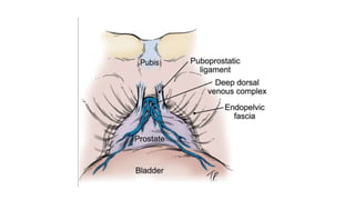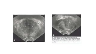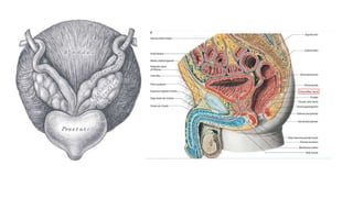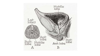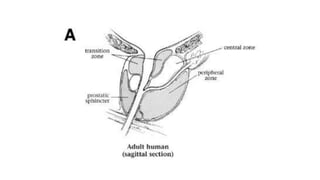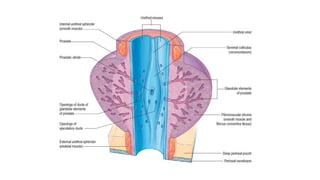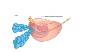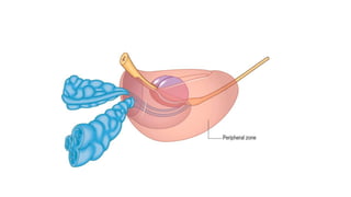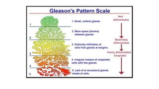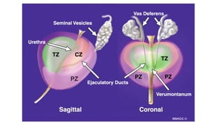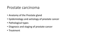 Prostate carcinoma is the most common cancer in men. It typically arises from the peripheral zone and spreads along the prostatic capsule. Diagnosis is usually made in the late 60s and treatment includes surgery, radiation, hormone therapy or active surveillance depending on staging. Having a family history, genetic factors, chronic inflammation and hormonal imbalances can increase risk.