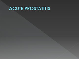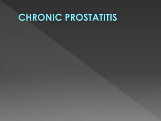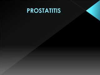 This document discusses prostatitis, an inflammation of the prostate gland. It is categorized as either acute or chronic and can be caused by various bacteria like E. Coli, Staphylococcus aureus, or sexually transmitted infections such as chlamydia. Symptoms include fever, pain, and difficulties urinating. Diagnosis involves a digital rectal exam of the prostate and tests of prostate massage fluid or urine to check for signs of infection. Treatment generally involves antibiotics after identifying the specific causing bacteria.