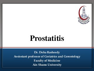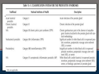 This document discusses prostatitis, an inflammation of the prostate gland. It describes the different classifications of prostatitis including acute bacterial, chronic bacterial, chronic prostatitis/chronic pelvic pain syndrome, and asymptomatic inflammatory prostatitis. Treatment options are provided for different types, including antibiotics for acute bacterial prostatitis and supportive care. Diagnostic tests like urinalysis, EPS examination, and imaging are also outlined.