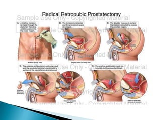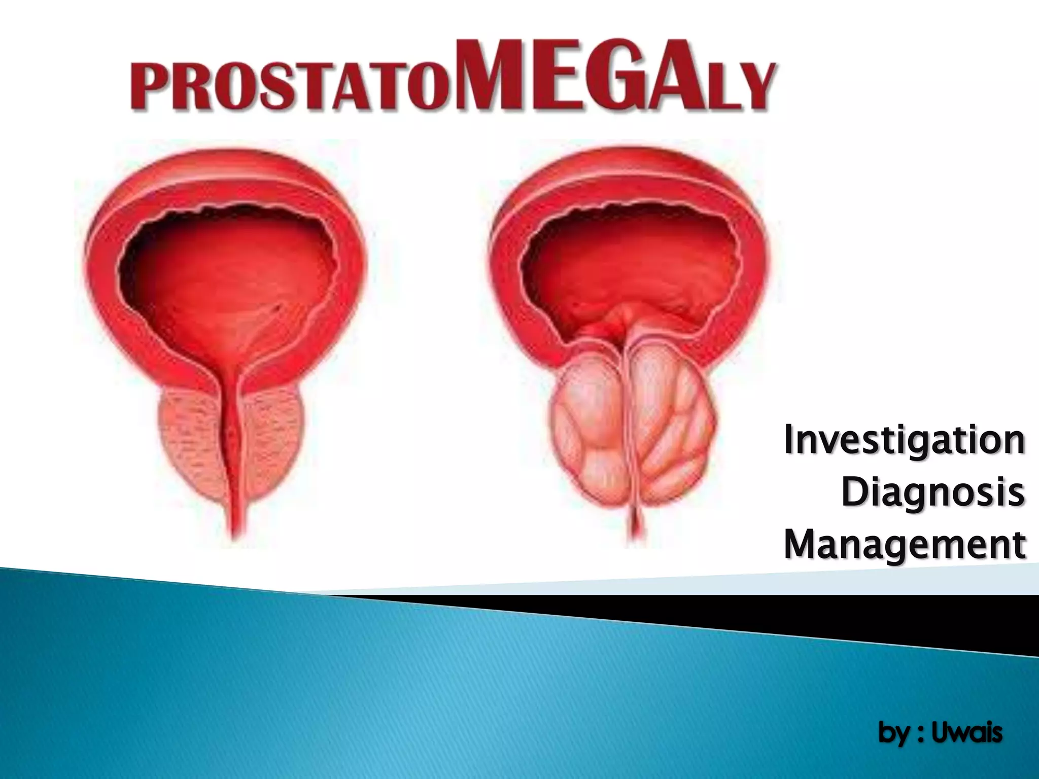 The prostate gland is located below the bladder and surrounds the urethra. It secretes fluid that protects and nourishes sperm. The size and shape of the prostate can change with age due to conditions like benign prostatic hyperplasia (BPH) and prostate cancer. BPH involves noncancerous growth of the prostate and commonly causes urinary symptoms in older men. Prostate cancer develops from cells in the prostate and risks include family history and diet. Investigation may include a digital rectal exam and PSA testing while treatment options depend on cancer stage and severity of symptoms.
