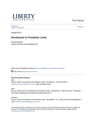 This document provides an overview of prosthetic limbs, including their history, development, materials, types, and construction process. It discusses how prosthetics have evolved from primitive wooden rods to modern devices using materials like carbon fiber and microprocessor technology. The main causes of amputation and levels of prosthetic feet are outlined. Rehabilitation is important for patients to learn to use their new prosthesis.