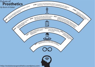The document outlines the history of prosthetics from ancient times to the future, highlighting significant developments such as the introduction of functional prosthetics in ancient Egypt, advancements during the Renaissance, and the rise of myoelectric prosthetics in the 20th century. It also discusses modern breakthroughs like DARPA's initiatives and the evolution of prosthetics towards customization and integration with technology. Looking ahead, it predicts a future where prosthetics are highly advanced, with increased regulation and enhancements available.
