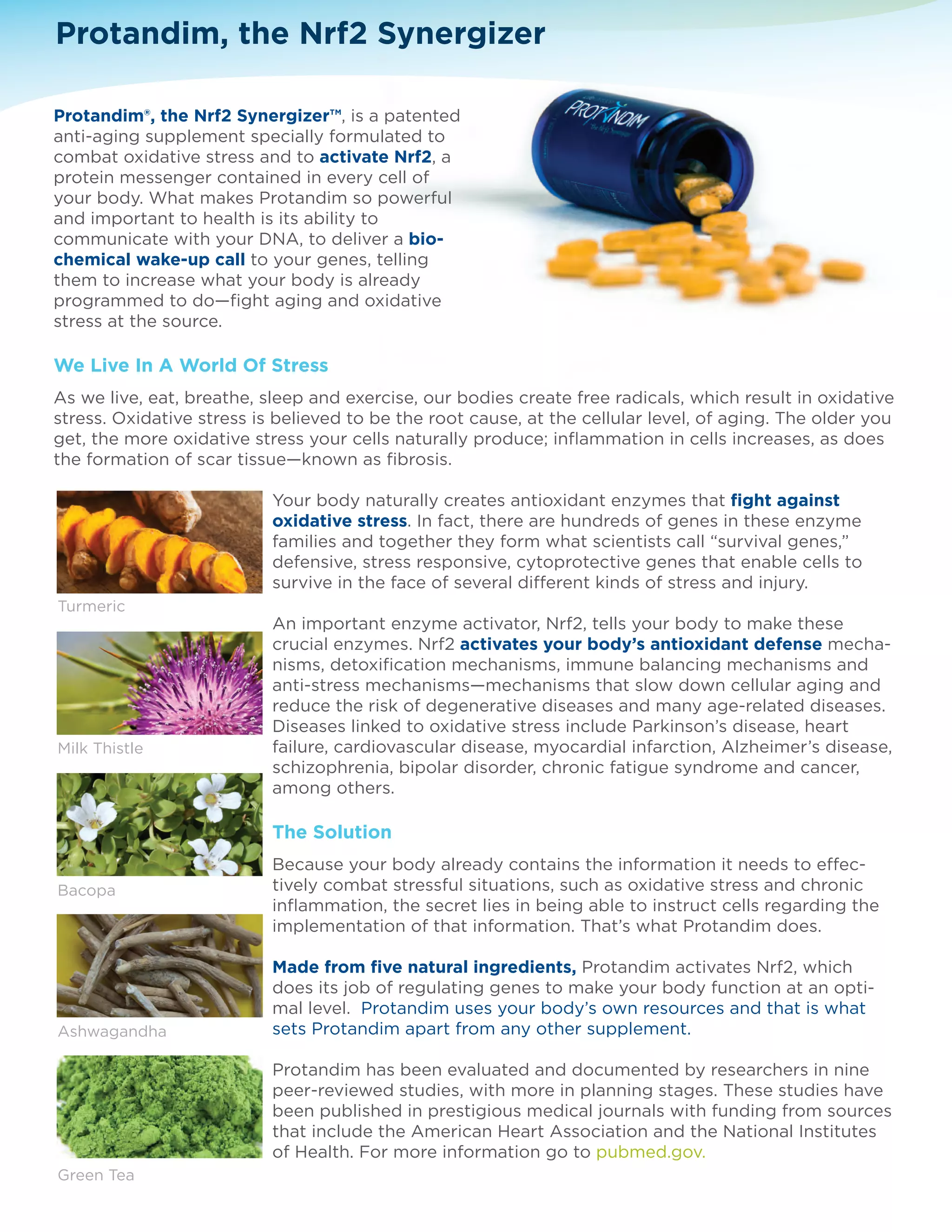 Protandim is a patented supplement that activates the Nrf2 protein to boost the body's natural antioxidant defenses and reduce oxidative stress. It is made from five natural ingredients and has been shown in nine peer-reviewed studies to help fight aging and disease by increasing the expression of hundreds of protective genes in cells. Protandim spokesperson Donny Osmond credits taking the supplement for two years with helping him maintain his youthful appearance and health.