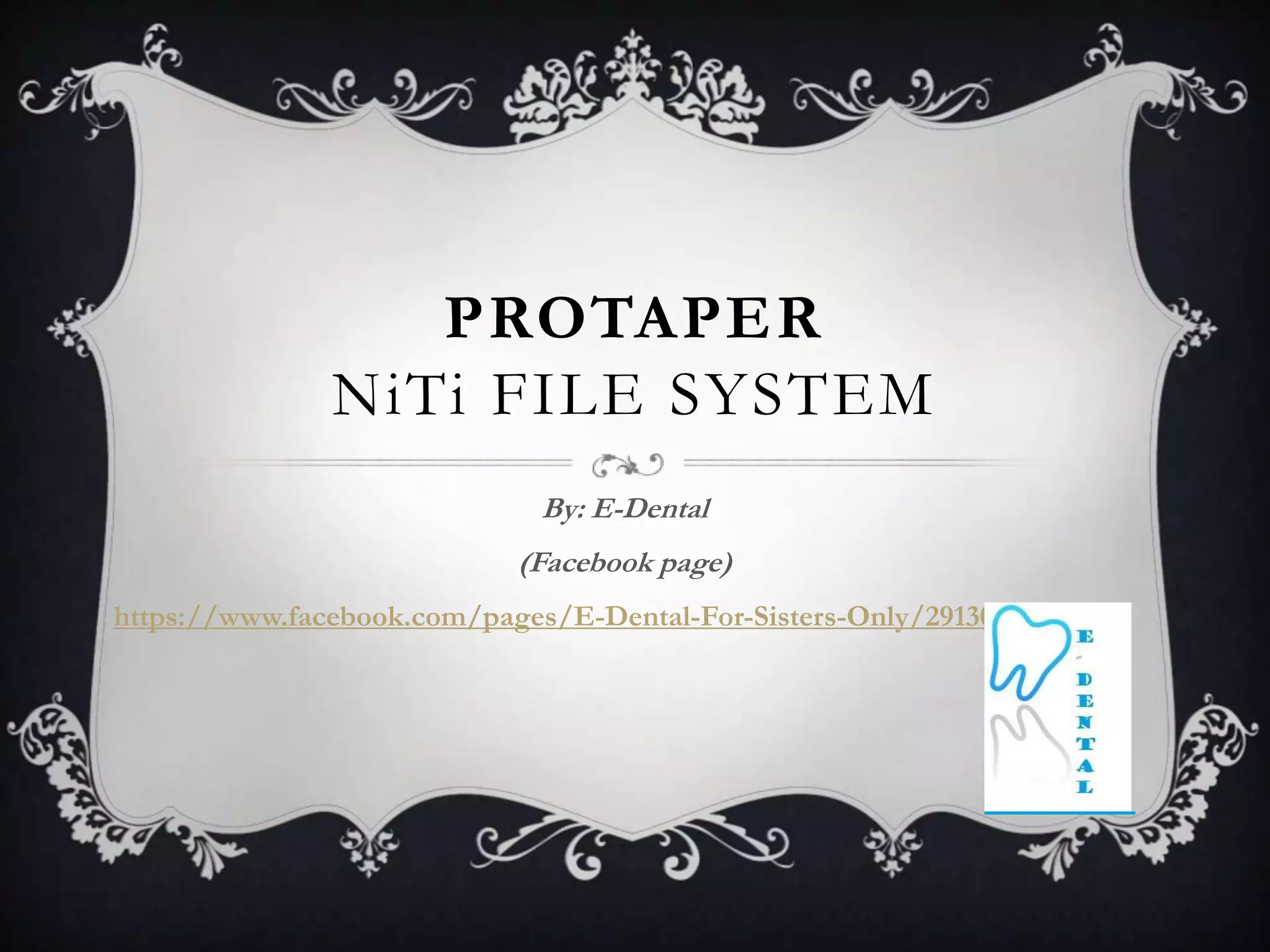 The ProTaper file system consists of shaping and finishing files for root canal procedures. The shaping files include primary files S1 and S2, and auxiliary file SX, each with a variable taper over their cutting blades. The finishing files range from F1 to F5, with increasing tapers and tip sizes. The document recommends watching a video demonstration and liking the Facebook page for more information.