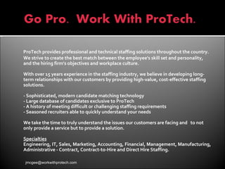 ProTech provides professional and technical staffing solutions throughout the country, striving to create the best match between employees' skills and employers' needs. With over 15 years of experience, ProTech believes in developing long-term customer relationships by providing high-value, cost-effective staffing solutions using sophisticated technology and a large database of exclusive candidates. Specialties include engineering, IT, sales, marketing, accounting, finance, management, manufacturing, and administration.