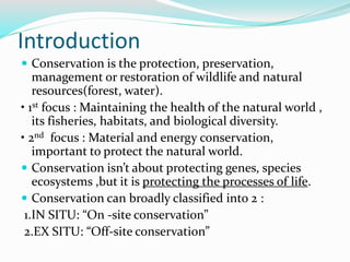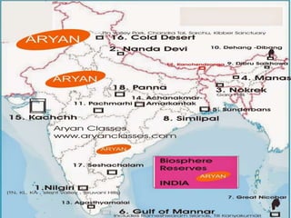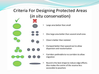 Protected areas are a cornerstone of in situ conservation and include national parks, bioreserves, and sanctuaries. They are managed areas dedicated to protecting biodiversity. The International Union for Conservation of Nature has established seven categories of protected areas and guidelines for their management. India has over 600 protected areas covering a variety of ecosystems and hosting many endangered species. These areas help maintain biodiversity through conserving habitats and genetic diversity. Biosphere reserves specifically aim to balance conservation and sustainable development through zoning of areas for strict protection and various levels of human involvement. India has established 18 biosphere reserves recognized for their unique biodiversity and ecosystems.
