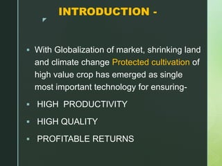 The document discusses the importance of protected cultivation in horticulture, highlighting its benefits such as higher productivity, better quality, and efficient resource use. It details various types of polyhouses and cultivation methods, including hydroponics and aeroponics, as well as government initiatives to promote these practices. The text also outlines the criteria for site selection, advantages and disadvantages of polyhouse technology, and potential crops suitable for protected cultivation.