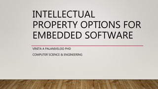 This document discusses intellectual property options for embedded software components. It outlines different types of intellectual property like patents, copyrights, and trade secrets. It provides examples of what parts of embedded software projects might be protected under each type of IP, such as novel algorithms under patents or source code under copyright. It also discusses popular myths around intellectual property and methods that can be used to protect source code.