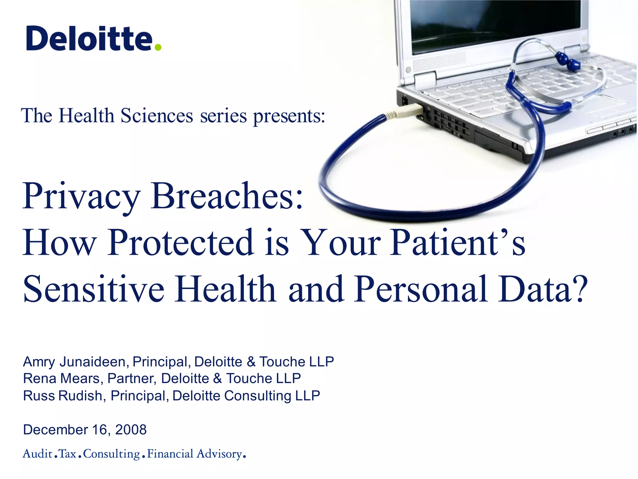 The document discusses the challenges and strategies involved in protecting sensitive patient health and personal data amidst increasing collaboration in healthcare. It highlights causes of data breaches, their impacts, and emphasizes the importance of adopting a risk-based approach to data protection and governance. Various regulatory mandates and the need for organizations to improve their data protection capabilities throughout the data lifecycle are also addressed.
