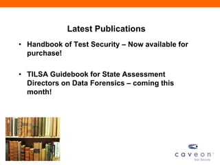 The document highlights upcoming Caveon events and webinars focused on test security and copyright protection. It addresses the threats posed by braindump websites that compromise test integrity and provides guidance on copyright law, enforcement, and the importance of building professional relationships in combating test security irregularities. Additionally, it discusses the nuances of copyright ownership, registration, and enforcement, emphasizing the need for proactive measures against infringement.