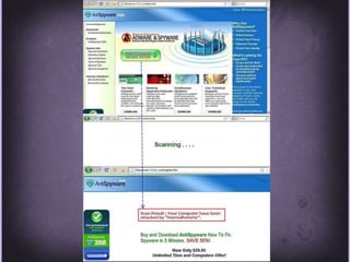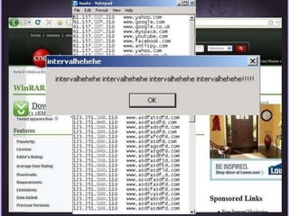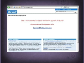 This document discusses protecting Windows networks from malware. It begins with two "immutable laws of security": if a bad actor can persuade you to run their program or alter the operating system, the computer is no longer yours. It then discusses current malware trends like compromising trusted websites and toolkits. Case studies show malware being spread through Facebook and Google. Best practices for defense include using defense-in-depth with policies, firewalls, host security, and continual patching and updates.