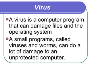 This document discusses how to protect your computer from viruses. It explains that viruses are programs that can damage files and operating systems. It recommends installing antivirus software, which identifies and removes viruses from memory, storage, and incoming files. It also advises regularly updating the antivirus software, as new viruses emerge over time.