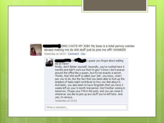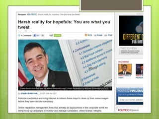 The document highlights the significant impact of social media on employers' hiring practices, with 45% of surveyed employers using these platforms to screen candidates. It recounts real-life examples of individuals whose online activities negatively affected their careers and legal outcomes, illustrating the potential dangers of public posts. The document concludes by suggesting awareness and management of online reputations as crucial for job seekers.