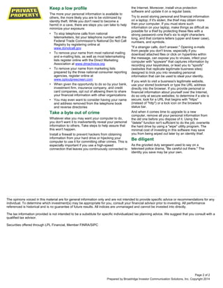 The document provides guidance on protecting oneself against identity theft, emphasizing the importance of safeguarding personal information such as social security numbers and regularly reviewing credit reports. It outlines preventive measures, including limiting the sharing of personal information, using secure technology, and properly disposing of sensitive documents. Additionally, it explains two types of identity theft: account takeover and application fraud.