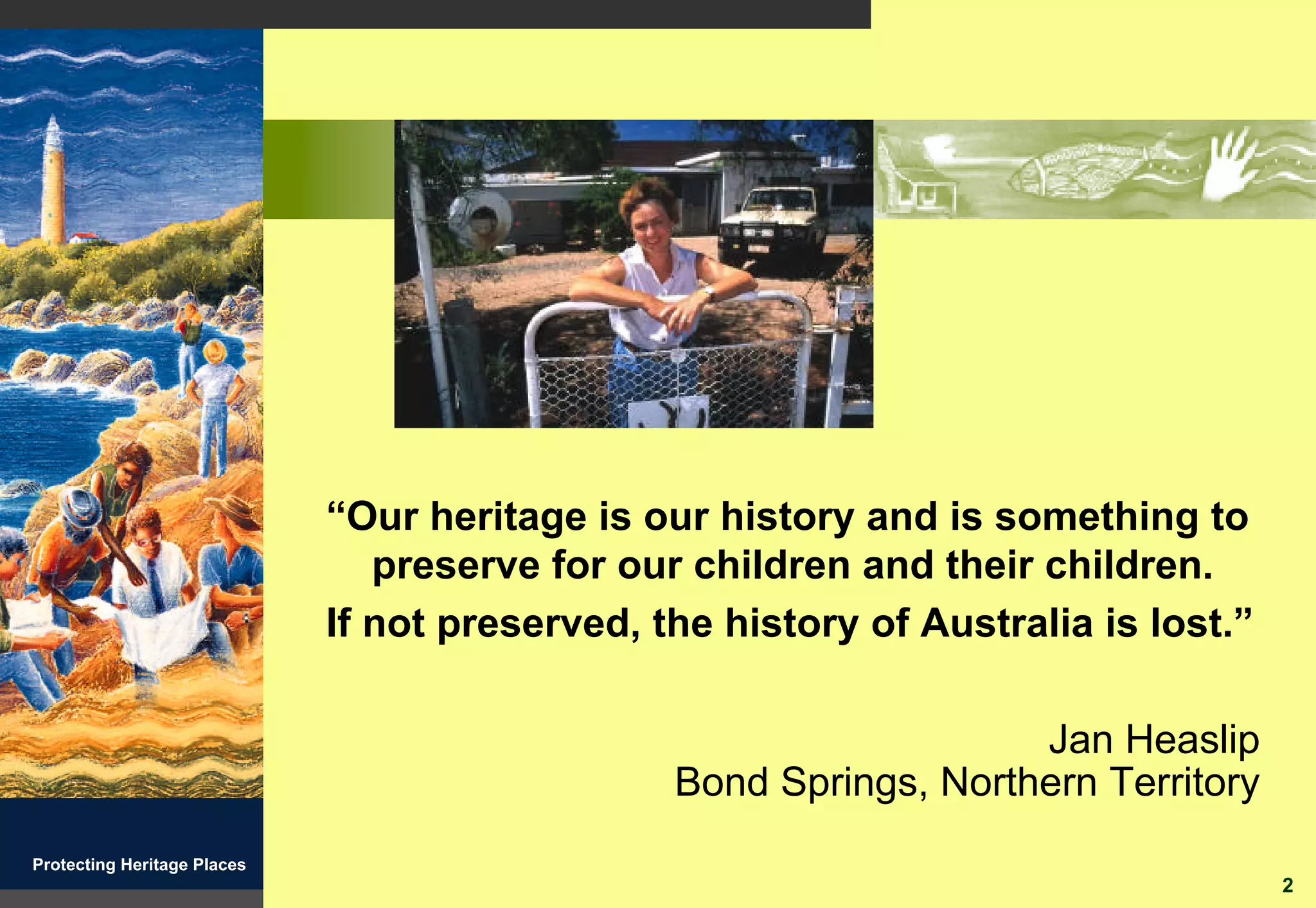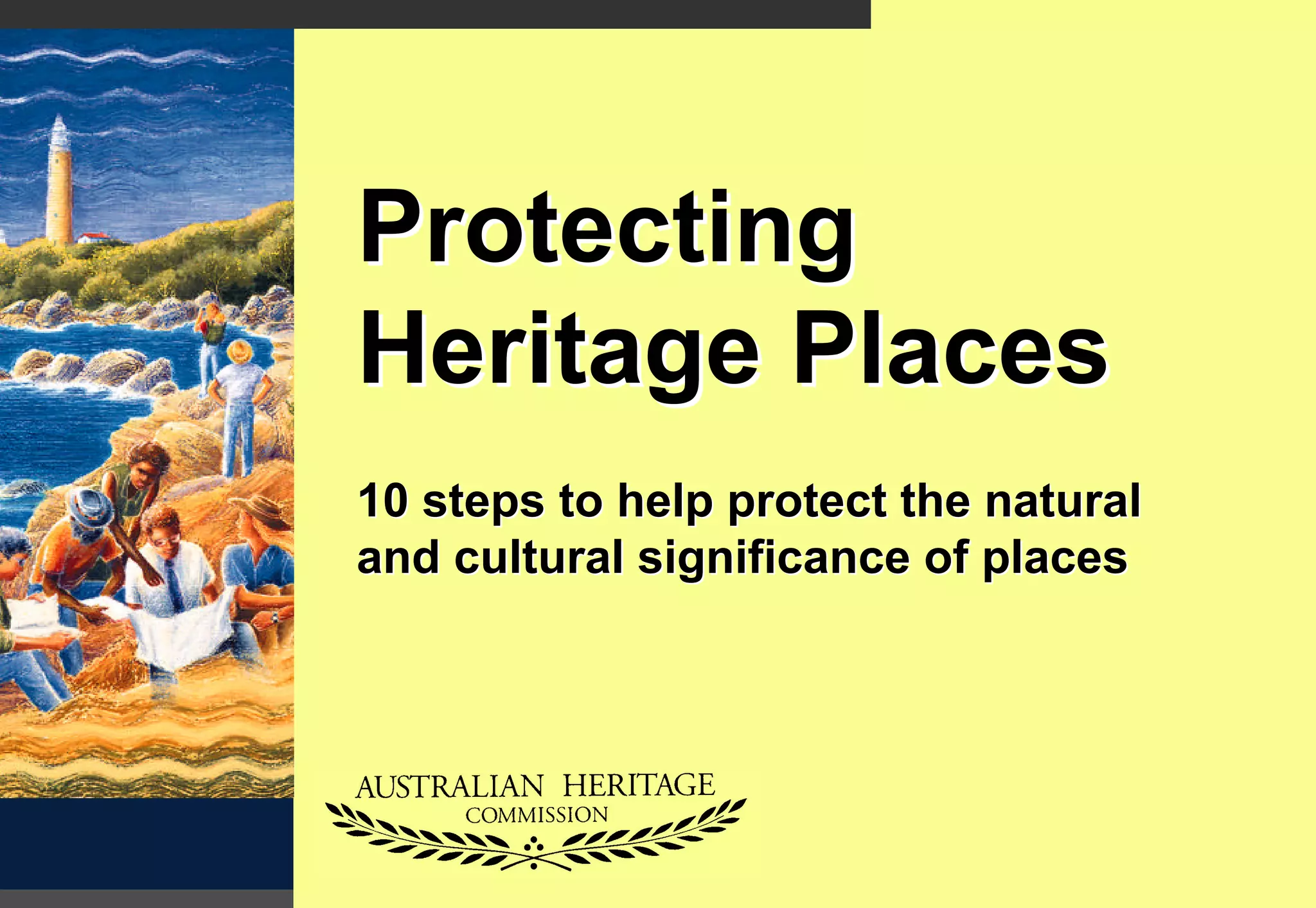 This document outlines 10 steps to help protect natural and cultural heritage places in Australia. The steps include: 1) Identifying the heritage place and what makes it significant; 2) Determining who has an interest in the place; 3) Researching what information is needed about the place; 4) Understanding why the place is important through a statement of significance; 5) Identifying any issues or threats to the place; 6) Developing objectives for what you want to achieve in protecting the place; 7) Developing strategies and actions to retain the significance of the place and meet the objectives; 8) Determining who is responsible for implementing strategies; 9) Monitoring and reviewing progress; and 10) Promoting and sharing the place's