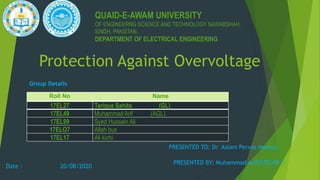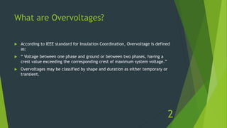 The document discusses overvoltages, defining them as voltages exceeding maximum system values and categorizing them into temporary and transient types. It elaborates on their causes—including internal factors like switching surges and external factors like lightning—and outlines methods for protection against lightning, such as earthing screens, overhead earth wires, and lightning arresters. Additionally, it includes review questions related to the types and causes of overvoltages, as well as concepts like arcing ground and surge absorbers.