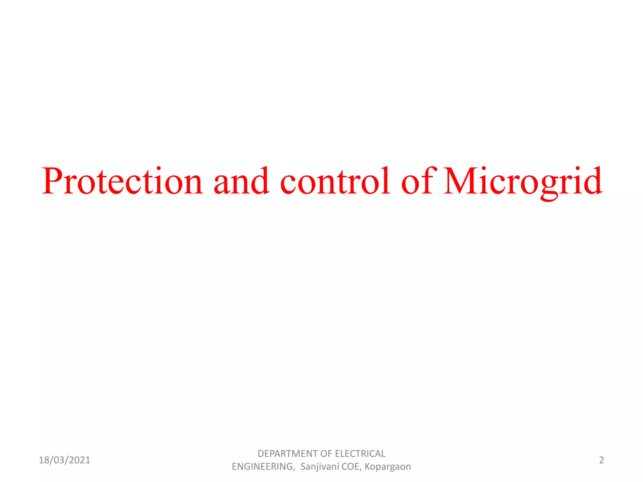 The document discusses various protection and control issues within microgrids during both grid-connected and islanded modes, highlighting the complexities of fault detection and management. It describes the hierarchical control system for energy management in microgrids, including primary, secondary, and tertiary levels, and addresses challenges such as bidirectional power flows, stability, and voltage control. Additionally, it outlines different protection schemes utilized for effective operation in both modes and emphasizes the need for advanced protection strategies to ensure reliability and efficiency.