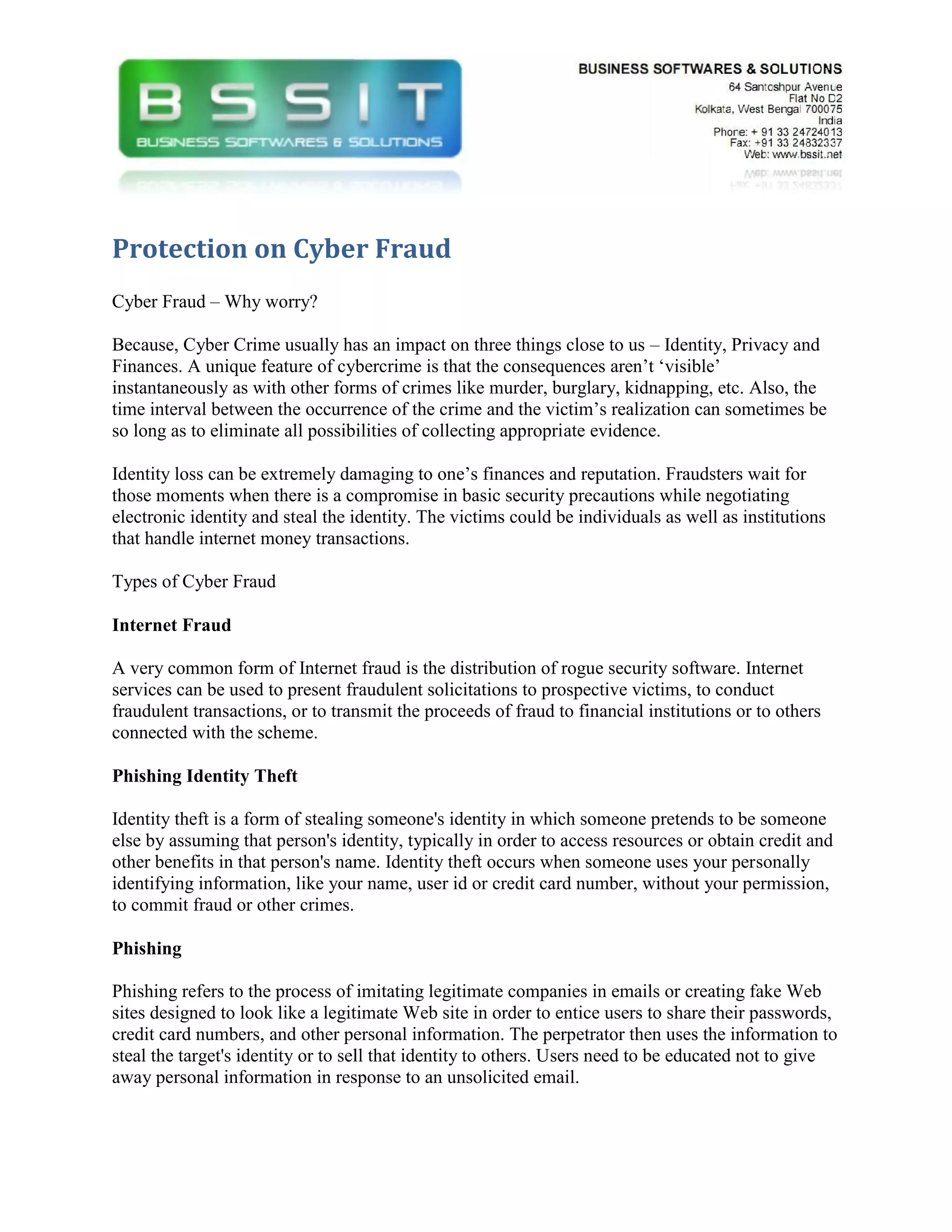 The document discusses cyber fraud and identity theft. It provides examples of common types of cyber fraud like internet fraud, phishing, and man-in-the-middle attacks. It emphasizes that identity loss from cybercrime can damage finances and reputation. The document also recommends ways to protect against cybercrime like using digital signature certificates, which provide authentication and security for electronic transactions. Victims of cybercrime can report incidents to local cyber crime police stations.
